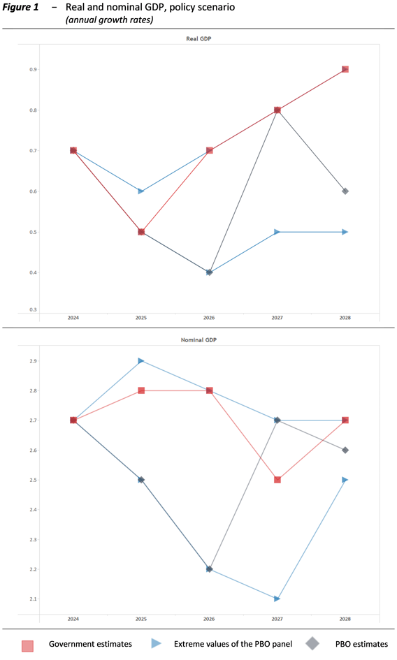 The MEF’s trend forecasts were validated as the main macroeconomic variables are within an acceptable range compared to the PBO panel’s expectations, although in several cases they are at the upper limit. The forecasts assume the full and timely implementation of the PNRR projects and the MEF’s assumptions on the international context. However, the latter is very unstable and fragile, and the PBO notes that the outlook could change significantly over the PFPD horizon.