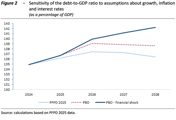 In order to assess how the debt-to-GDP ratio would evolve in the event of heightened pressure on the government bond yield curve, a variant of the PBO scenario with high market volatility (PBO scenario – financial shock) is also considered. In this scenario, the debt-to-GDP ratio would show a steadily increasing trajectory over the three-year period 2026-28. In 2026, the debt-to-GDP ratio would stand at 139.9 per cent of GDP, about 2.5 percentage points above the corresponding value in the PFPD. In the following years, the debt would continue to increase, reaching 142.2 per cent of GDP in 2028, about 5.8 points above the Government’s policy scenario.