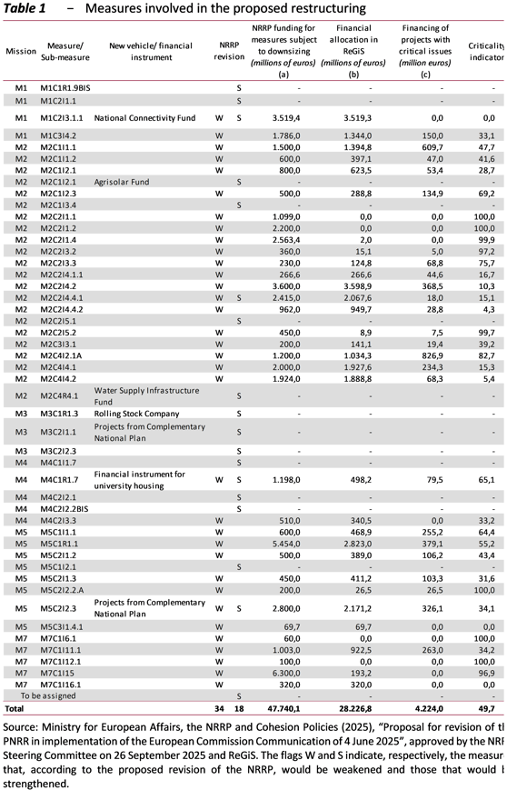 Based on ReGiS data as at 25 September, a criticality indicator (Ic) was used to verify whether the 34 measures subject to downsizing were indeed the most at risk of non-implementation, and whether other measures were in worse condition. Overall, 12 of the 34 measures subject to revision exhibit a high degree of criticality (Ic > 75 per cent). Conversely, 19 of these measures have an Ic below 50 per cent. Notably, the criticality values for these 19 measures are in many cases still higher than those found for measures not subject to changes.